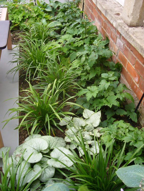 An eating area with modular seating has become the focal point of this garden which was an unpromising dark site originally. The slate paving is crisp and urban while the planting softens the scheme.