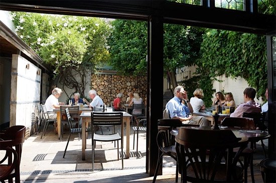 The brief was to turn a dark unsightly yard only used by smokers into a pleasant outdoor eating area. To ensure year-round use a log burner was installed, with an adjacent log wall to draw people into the courtyard. The stainless steel-topped tables with in-built seating and sleeper walls complete the look.